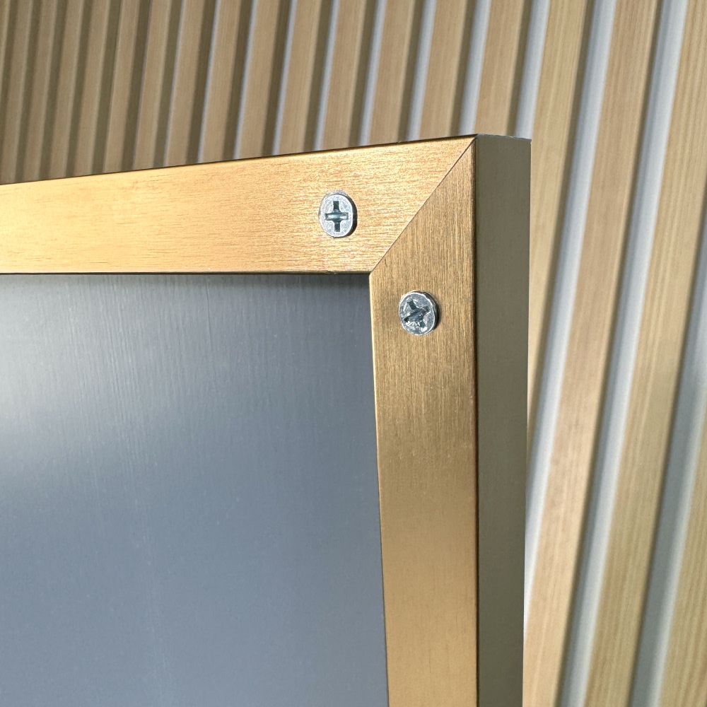 Рамка из первичного анодированного алюминия. В отличие от порошковой покраски устойчива к царапинам и не выцветает с течением времени. Ширина профиля по лицевой стороне 5 мм, ширина профильной стороны - 20 мм.